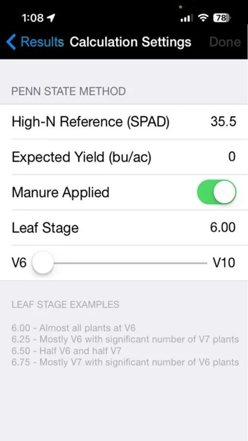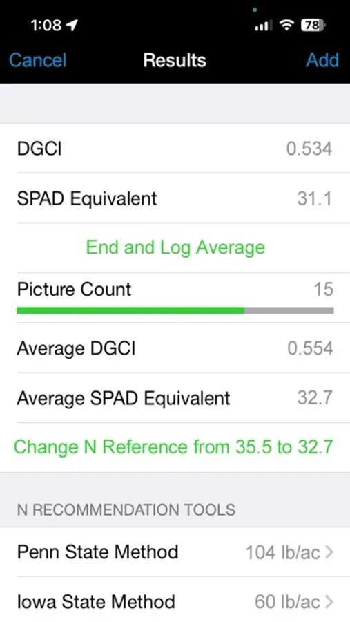 3. Read the results: DGCI, and for corn, a SPAD equivalent and nitrogen application recommendations based on university research when using high-Nitrogen reference strips.