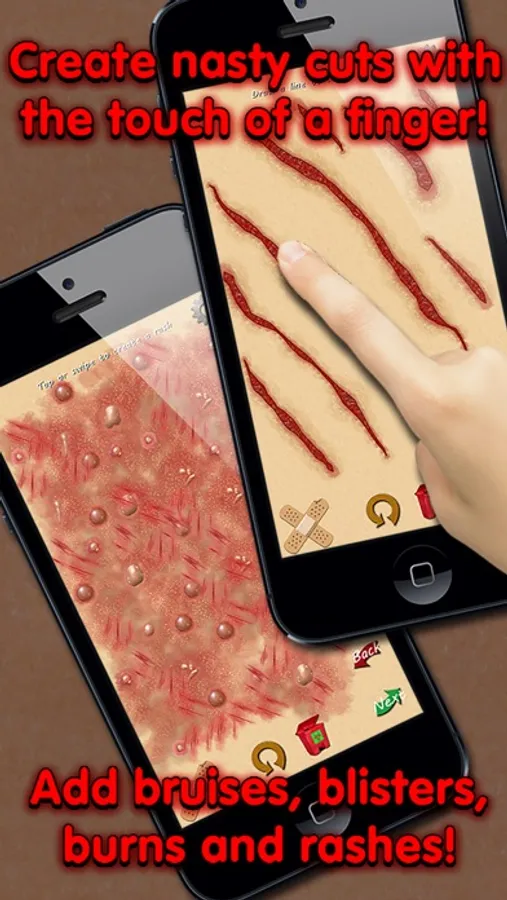 Come face to face with nasty injuries and ailments like cuts, scrapes, blisters, bruises, burns painful veins, rashes and even frostbite! All of them painted on with just the swipe of a finger!