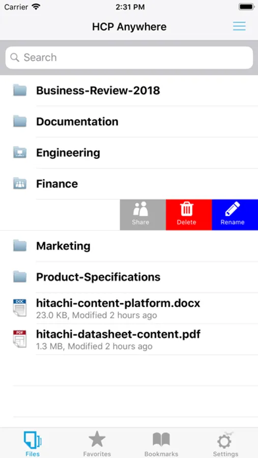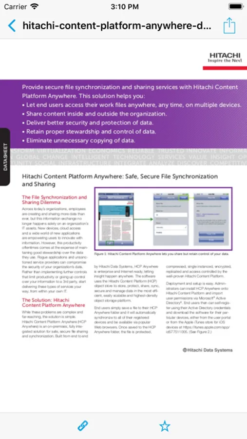 With your files stored in Hitachi Content Platform Anywhere, your data is automatically protected, preserved, secured and managed throughout its lifecycle and is always available. Lost your mobile device? Replace the device, download this app and all your data is back. No restores, no system checkpoints, no calls to the helpdesk; just you, your device and your data. Hitachi Content Platform Anywhere makes life easier: No more full email inboxes, no more wrestling with heavyweight content management applications, no more struggling to share large files. Just put the file into Hitachi Content Platform Anywhere and it will be available securely anywhere, at any time, on any device, and easily shared via a link rather than sending the entire file.