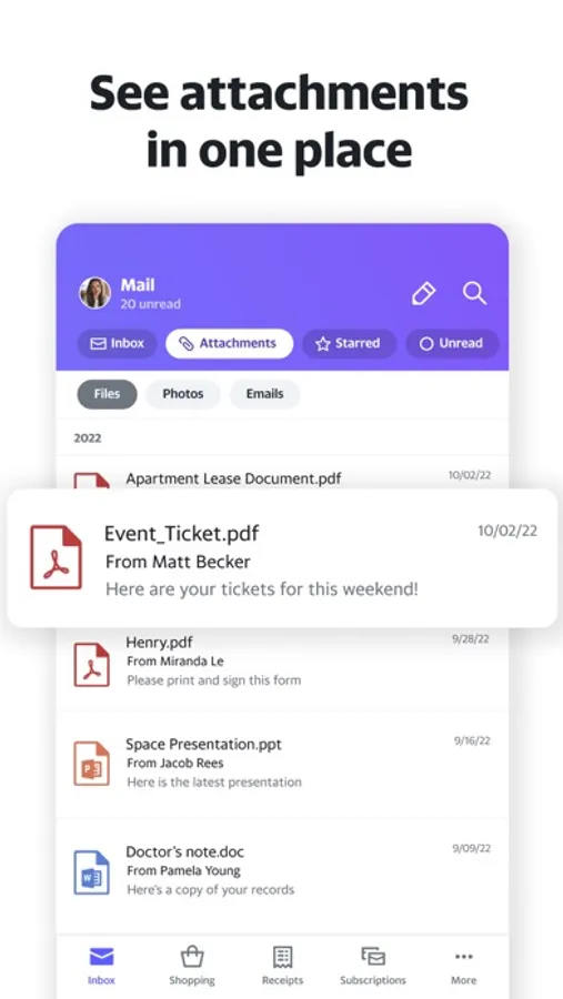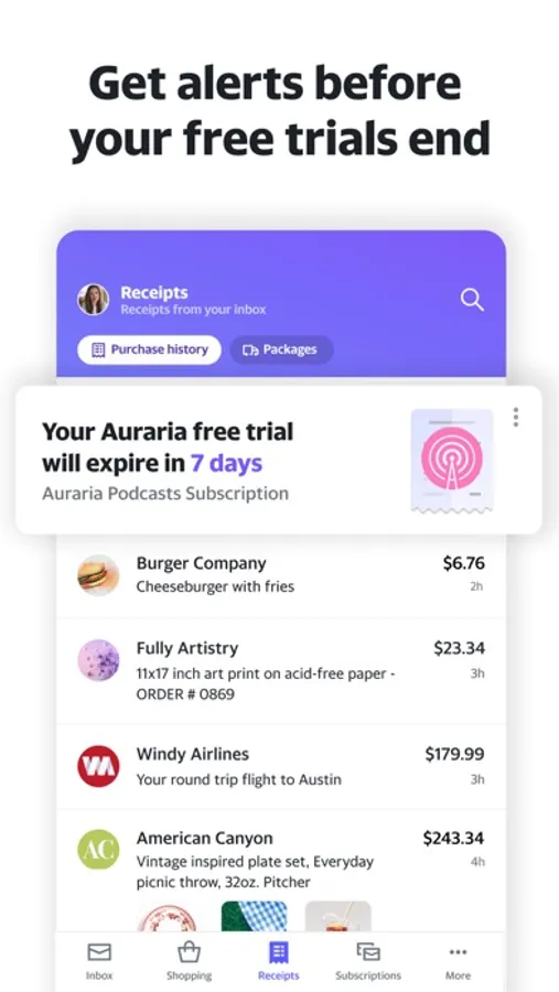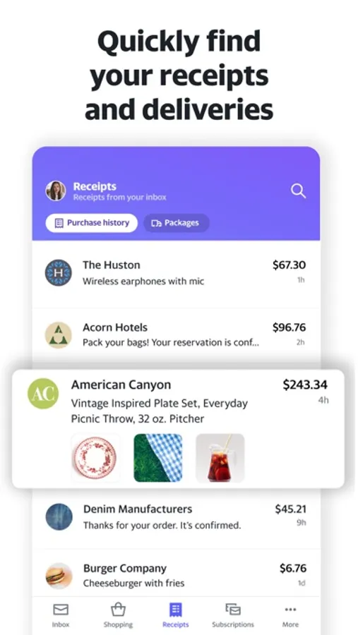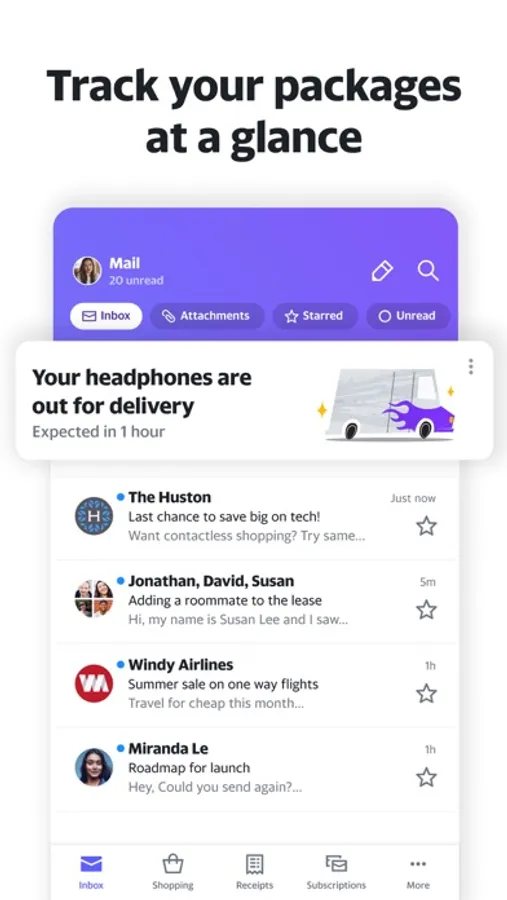 It's time to get stuff done with the Yahoo Mail app. Just add your Gmail, Outlook, AOL or Yahoo Mail to get going. We automatically organize all the things life throws at you, like receipts and attachments, so you can find what you need fast. Plus, we've got your back with other convenient features like one-tap unsubscribe, free trial expiration alerts and package tracking.