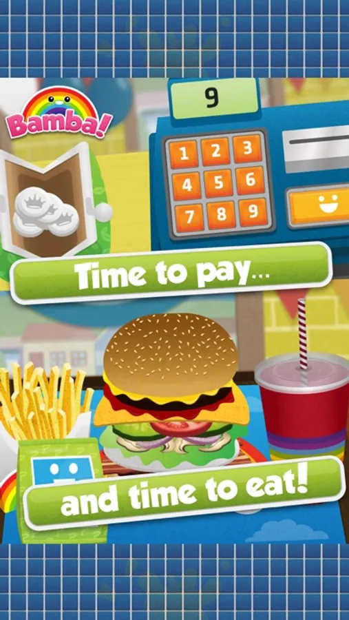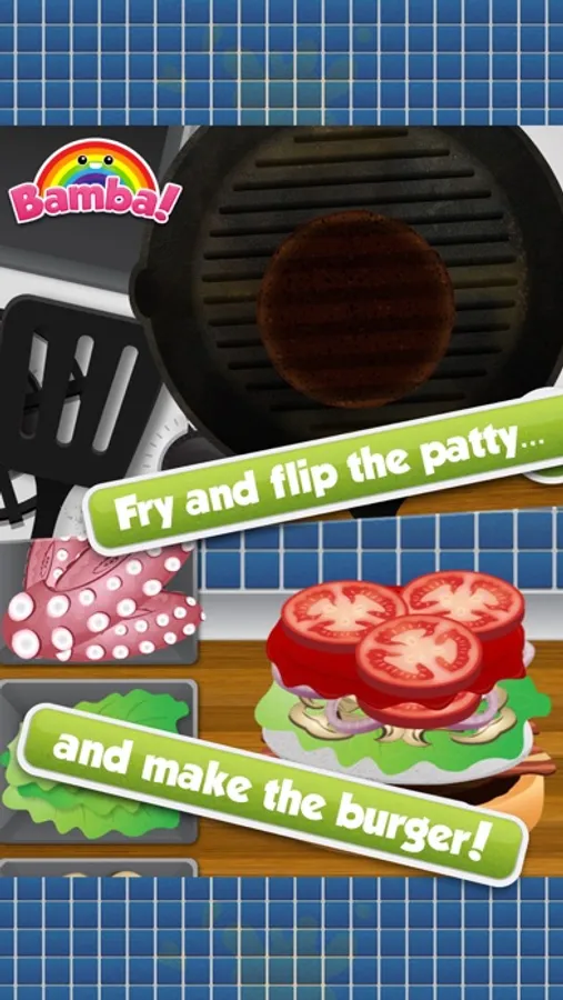 Kids create their favorite burger, flip the patty, make French fries and dispense the drinks – just like in a real fast food restaurant! They can choose from lots of funny ingredients to make their happy meal. (Check out Bamba Burger 2, the all new sequel with more fun stuff to do!)