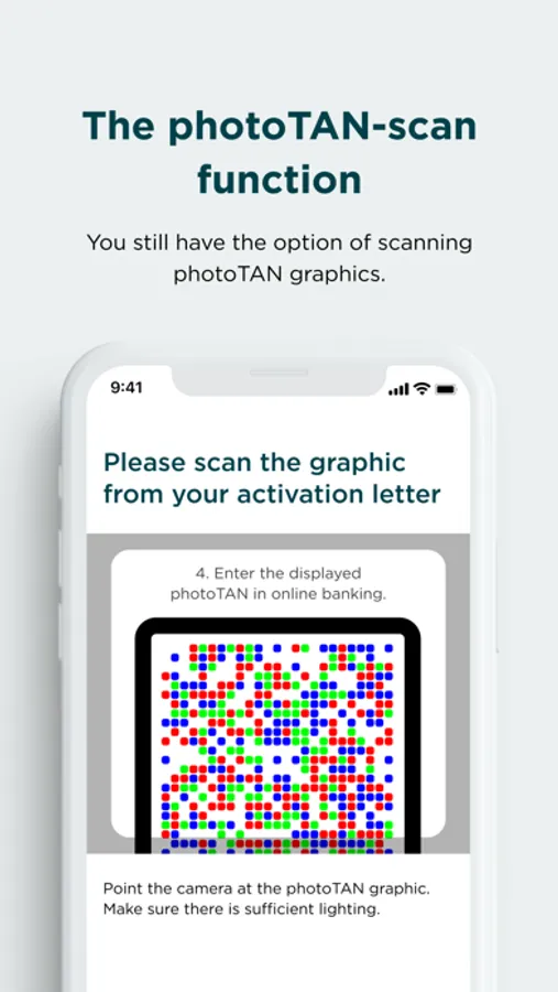 The photoTAN app is one of our security factors. The photoTAN is an important part of every login and transaction in your online and mobile banking. It is used to verify the order data you have entered and to generate the transaction number (TAN).