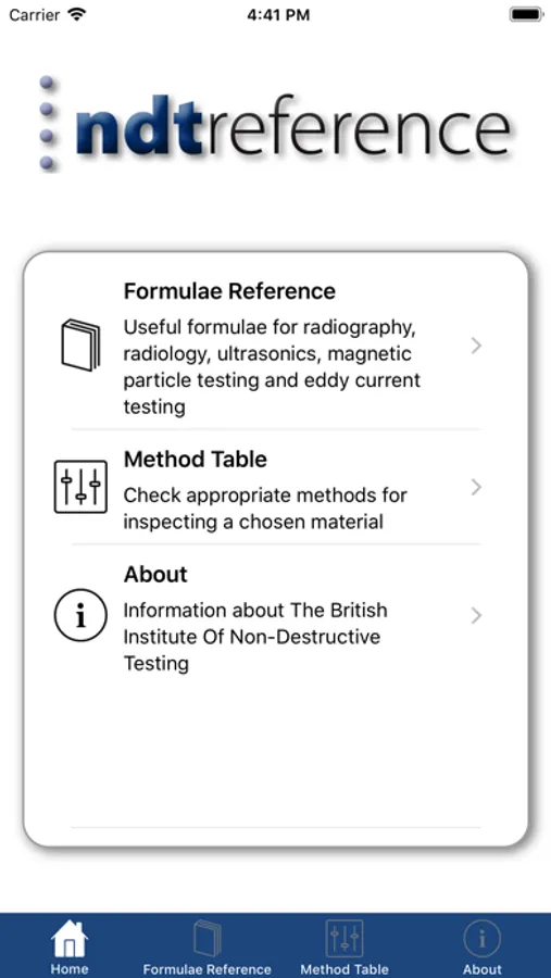 Prepared by members of the BINDT Technical Committee, this app is planned to help NDT practitioners and students to understand and use the formulae which are employed in NDT. It contains basic useful formulae used in radiography and radiology, ultrasonics, magnetic particle testing and eddy current testing. The ultrasonics section includes some values for ultrasonic velocities for a number of materials.