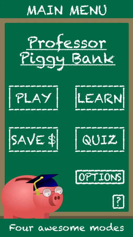 Professor Piggy Bank is a fun & educational app featuring the four major coins used in the United States. With this app you can learn about coins, save money by putting coins in a piggy bank, play a game, count money, and take a quiz. It's a great app for children to use to learn about coins while having fun. This app has four different modes; PLAY, SAVE $, LEARN, & QUIZ……..