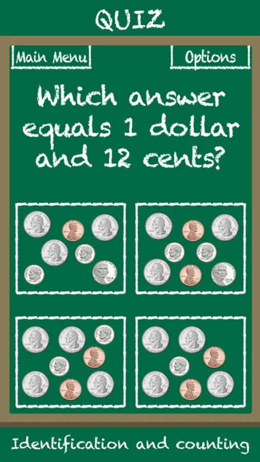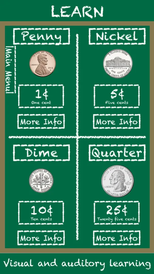 In LEARN mode, you can learn about how much each coin is worth, how they look on the front and back, and various other information. In QUIZ mode, there are a lot of different questions with multiple choice answers. The questions can be simply asking you to tap on a specific coin or how much a coin is worth, but most of the questions will involve figuring out/counting which set of coins it takes to equal a certain value. Both LEARN & QUIZ modes have voiced dialogue for auditory learning, but it can be turned on or off in the settings.
