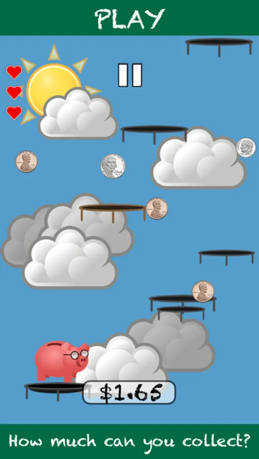 In PLAY mode the object of the game is to bounce the piggy up and collect coins while avoiding blocks and falling down. This mode features two control options so you can either Tilt the device to move the piggy left & right or select Touch for on-screen arrows. The results screen at the end of each game also shows you how many of each coin was collected and the total values.
