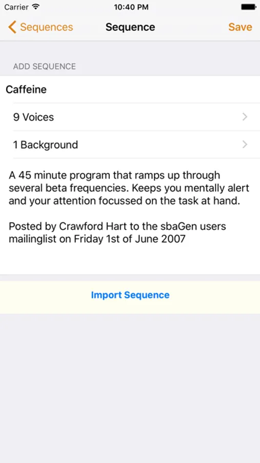 This program enables you to create your own Binaural Beat sequences by layering multiple voices and background sounds on top of each other. Each session consists of one or more voices and backgrounds. Each voice can have a different start and end carrier frequency, beat frequency and volume. This means you can 'slide' up or downto a certain MindState. Each voice and background can have starting time greater than zero. This enables you to layer different tracks onto each other (see caffeine for example).