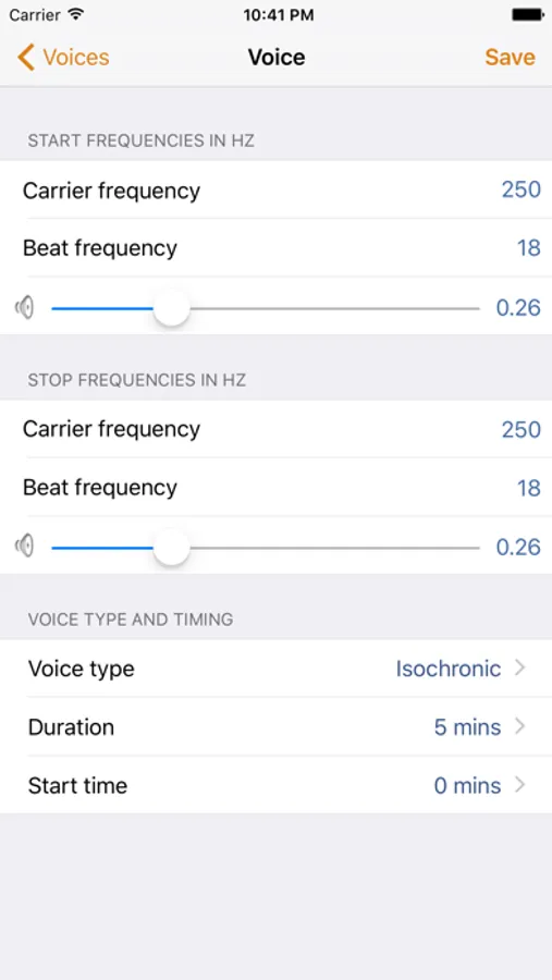 - set different start- and stop values on a voice for volume, carrier- and beat-frequency