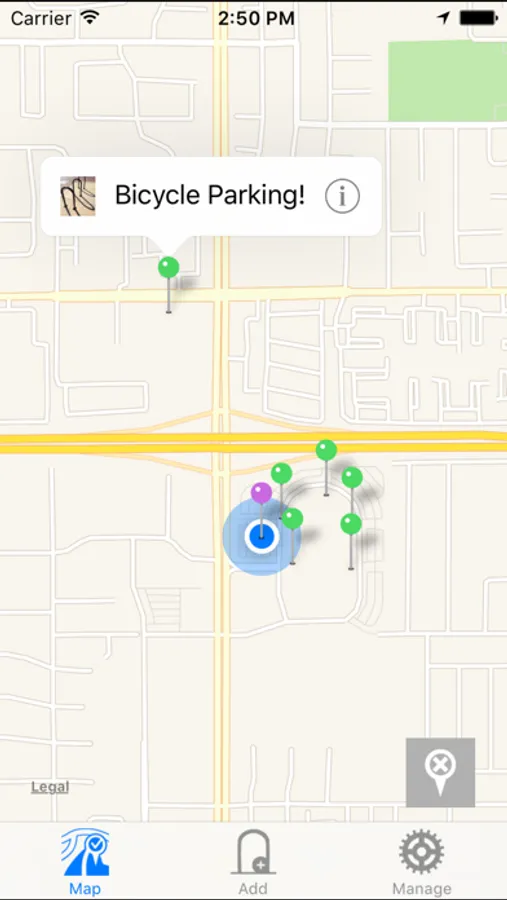 All green markers are user generated data with an image of the bicycle parking area and optional notes. All purple dots are from external data sources such as city data, department of transportation or other bicycle parking projects. External data has not been confirmed. It is pretty simple. If you are looking for bike parking, open the app and look at the map in the area where you want to park. If there isn't anything yet you can help by snapping a quick picture and sending it in when you find a bike rack or any other bicycle parking that isn't on the map yet!