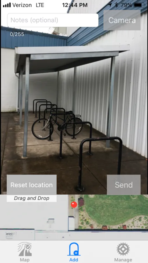 - Select the "Add" tab to add bicycle parking spots to the public map. Pinpoint the bicycle parking location with drag and drop feature.