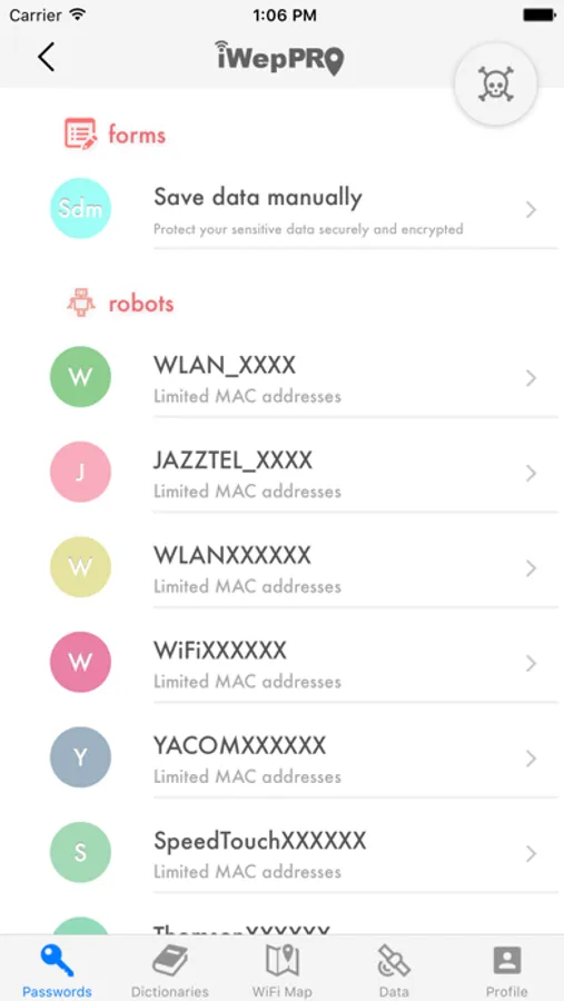 With #iWepPRO WiFi Passwords you can create or calculate passwords for all your needs, you can choose between create a manual record typing your data manually, or you can choose a robot in order to calculate the best password for you. Easy, isn't it?