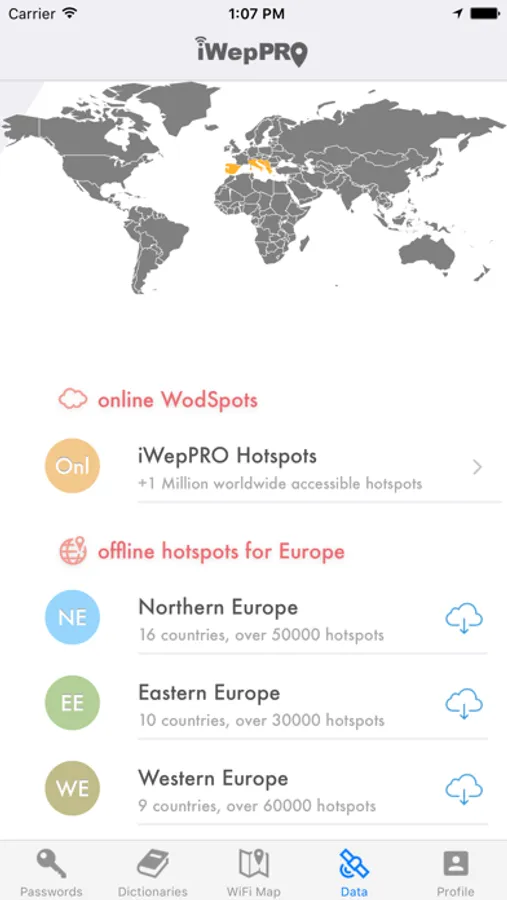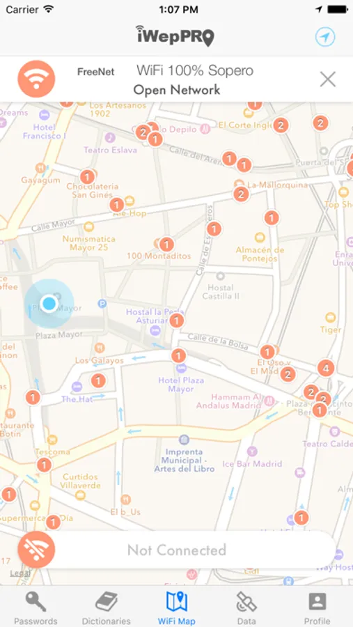 WiFi map at first run is empty, you have to visit 'Data' tab and unlock WodSpots or download the free WiFi hotspots database for your location. You will see a world map where you can select your country and download #iWepPRO database.