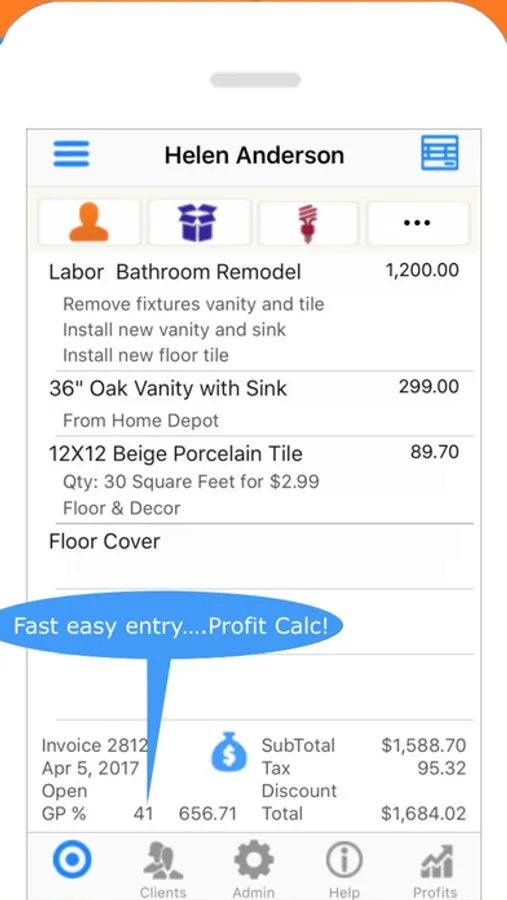 Signature Capture of approved Estimates with an update of Status. Invoices and Estimates may be copied for editing and reuse with other clients.