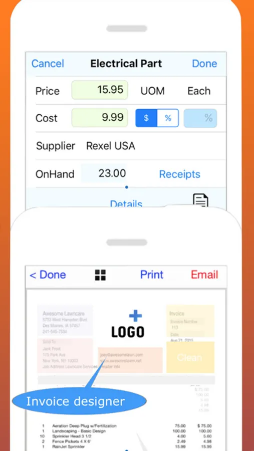 Document Design & Delivery- Change document field names of invoice and estimate documents, change formats easily with unique design for invoices and estimates. Use your local language and terms. Batch deliver Printed & Email docs.