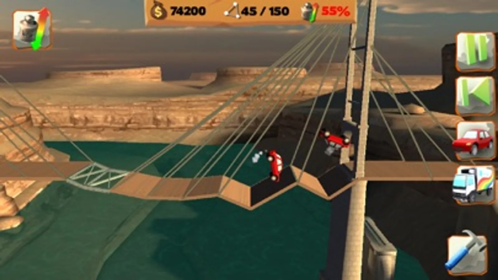 Bridge Constructor Playground offers people of all ages an introduction to the topic of “bridge building”. This game gives you the freedom to let your creative side run riot – nothing is impossible. Across 30 innovative levels you have to build bridges over deep valleys, canals or rivers. Following this your bridges will be subjected to a stress test to see whether they can support the weight of the cars and/or trucks which drive across them.