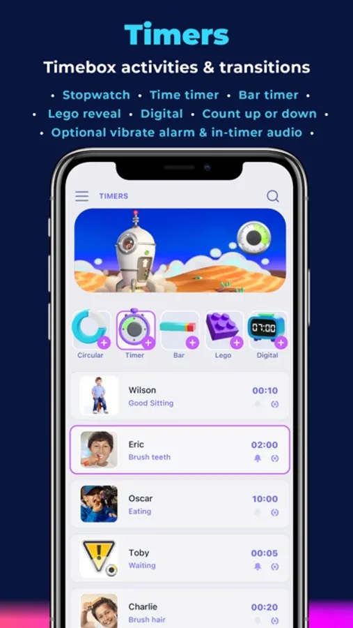 • In-timer audio, an autism first!, The audio plays during the timer & stops when the timer ends which removes the fight or flight response created by other timers