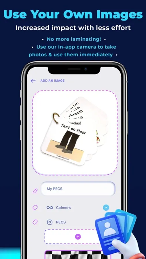 Import photos of communication cards, PECS® & things that your child’s uses/sees (eg the meal they are about to eat, the clothes they are about to wear etc) to remove ambiguity & confusion, especially if your child is literal.