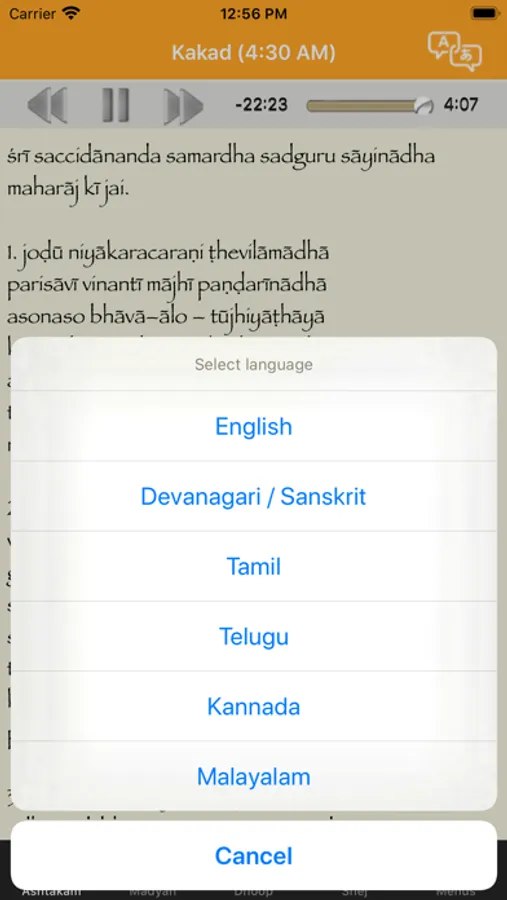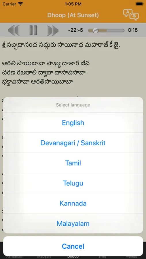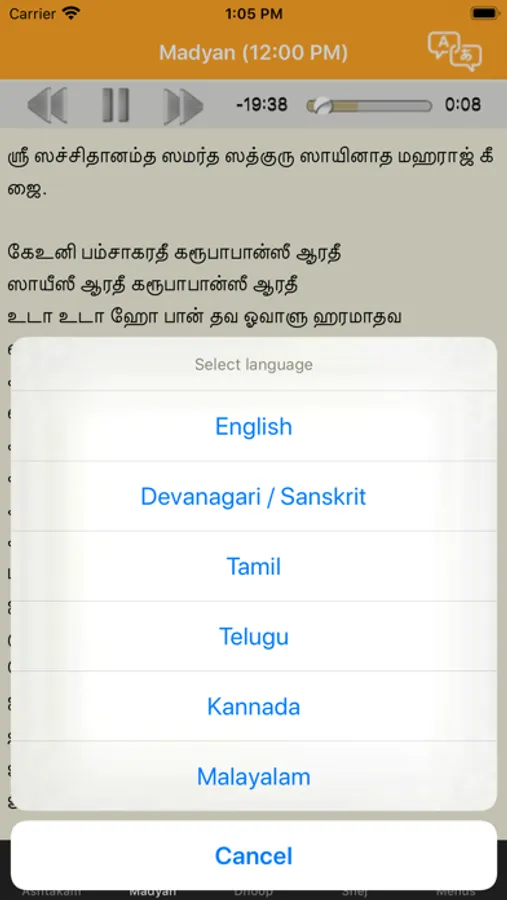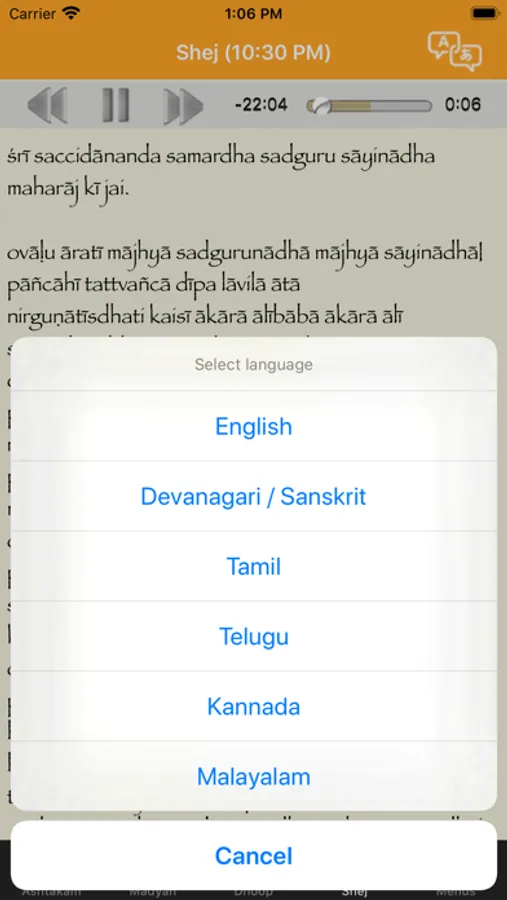 #2 . Sai Ashtothram (108 names) provided with the audio and text to sing along with multi language support like English, Tamil, Sanskrit, Telugu, Kannada with each Arathi to sing along by just tapping Language icon in the top right hand side. You can zoom the lyrics as per your convenient.