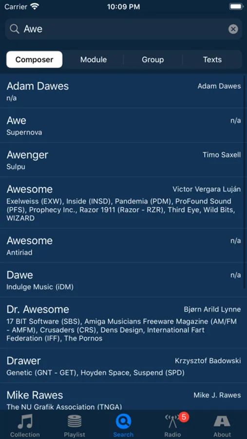 You can do searches in the catalog by composer, group or module name, or module internal texts. Download mods for playback later offline and build playlists from your local modules. 4champ radio feature lets you listen to endless stream of music effortlessly.