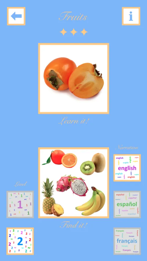 App with a delightful design with words grouped in themed collections, with their images and narrations in English, French, and Spanish.