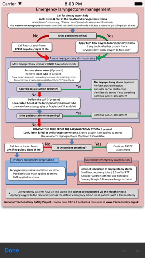 The emergency algorithms are the product of a unique multidisciplinary collaboration between key stakeholders in airway and tracheostomy care. These groups are listed below. The algorithms are within the App for emergency use, but also have interactive links to videos which describe and illustrate the key steps in emergency management (internet connection required).