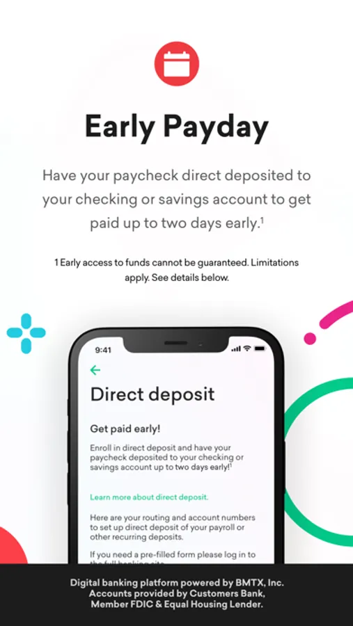 1 Funds from payroll-related direct deposits may be made available up to two days early. Early access to payroll deposits applies to the direct deposit of funds from your employer. Employer direct deposits vary and, as a result, it is not possible to guarantee early access to your pay. Factors that will affect this include the sender’s deposit description used and the timing of their submission of deposit. In order to provide this service, we generally post such deposits on the business day we receive notice that the deposit is scheduled, which may be up to two (2) business days earlier than the payer’s scheduled payment date. In general, benefit checks (direct deposit or otherwise) from the federal or state government will not be eligible for early access based on the parameters we use. As an example, benefits that generally would not receive early access include but are not limited to unemployment, retirement, pension, civil service, railroad retirement and veteran’s payments.