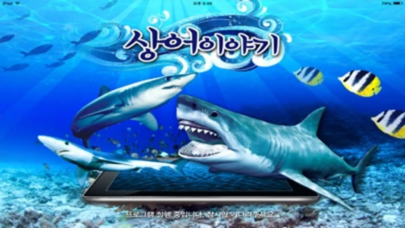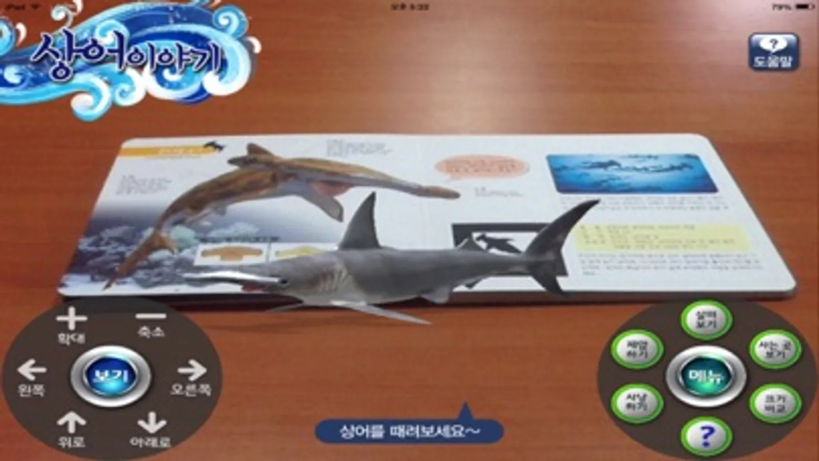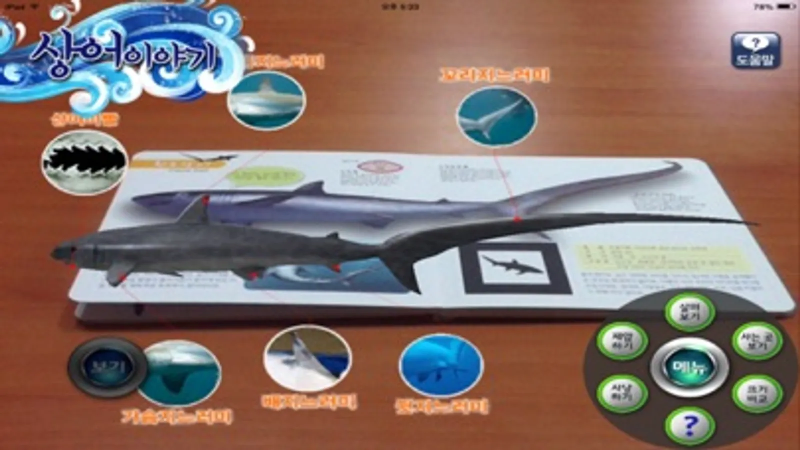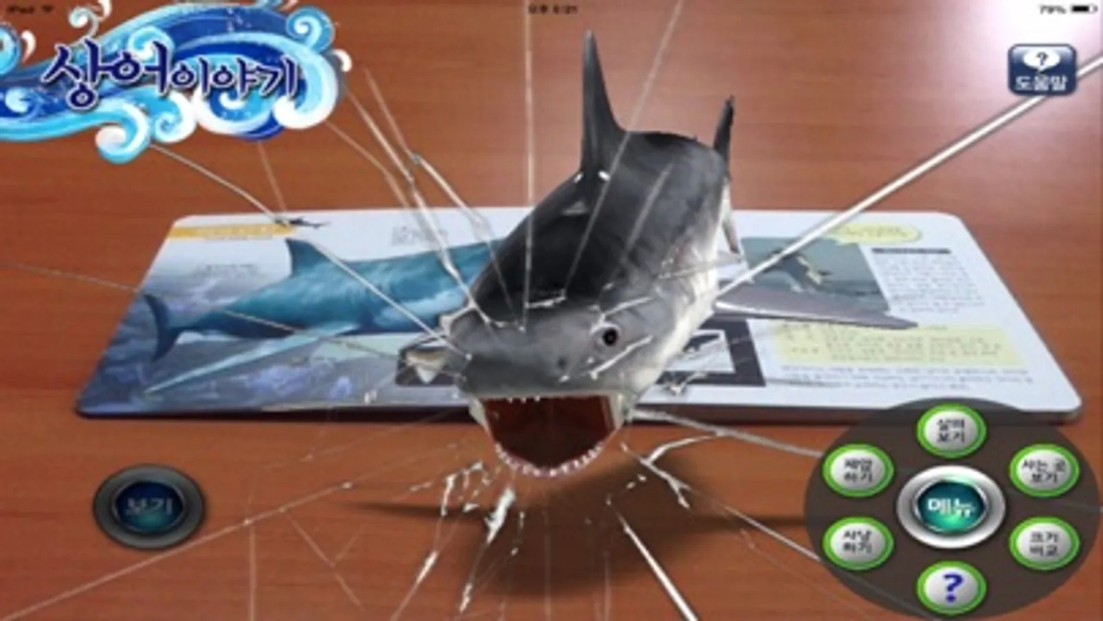 3. '상어이야기' 어플리케이션 실행 후, 프린터한 이미지 또는 PC 화면의 이미지를 카메라 화면에 비추면 증강현실 애니메이션을 감상하실수 있습니다.