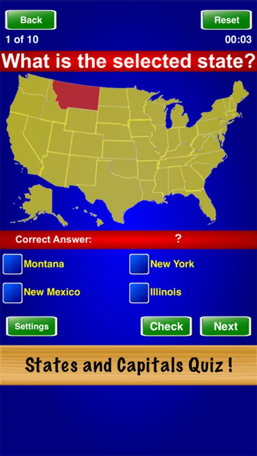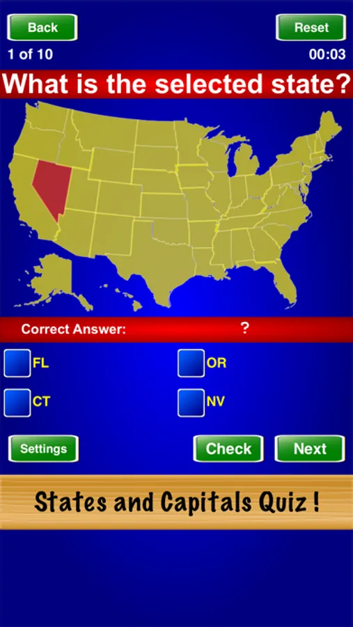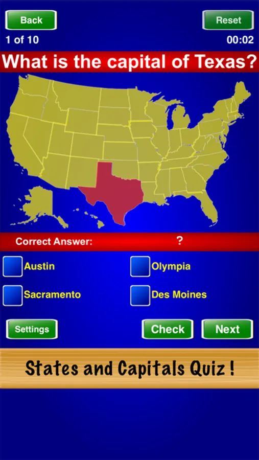 States and Capitals Quiz ! is a great way to test your knowledge of the states and capitals of the U.S. Select the test mode, difficulty level, and number of questions in the "Settings" screen. Play until you master the game.