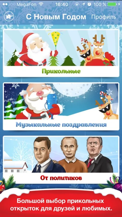 Приложение содержит большую базу поздравлений с Новым Годом и Рождеством, что позволит каждому найти подходящую открытку. Музыкальные, от политиков, в стихах, прикольные, от знаменитостей, для коллег, друзей, любимых, родственников, детей.