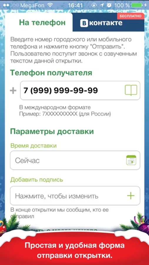 Можно прослушать любое из них, а затем, указав телефонный номер из записной книжки своего iPhone, отправить его получателю в любую страну мира. Адресат получит твое поздравление в виде звонка на мобильный телефон.