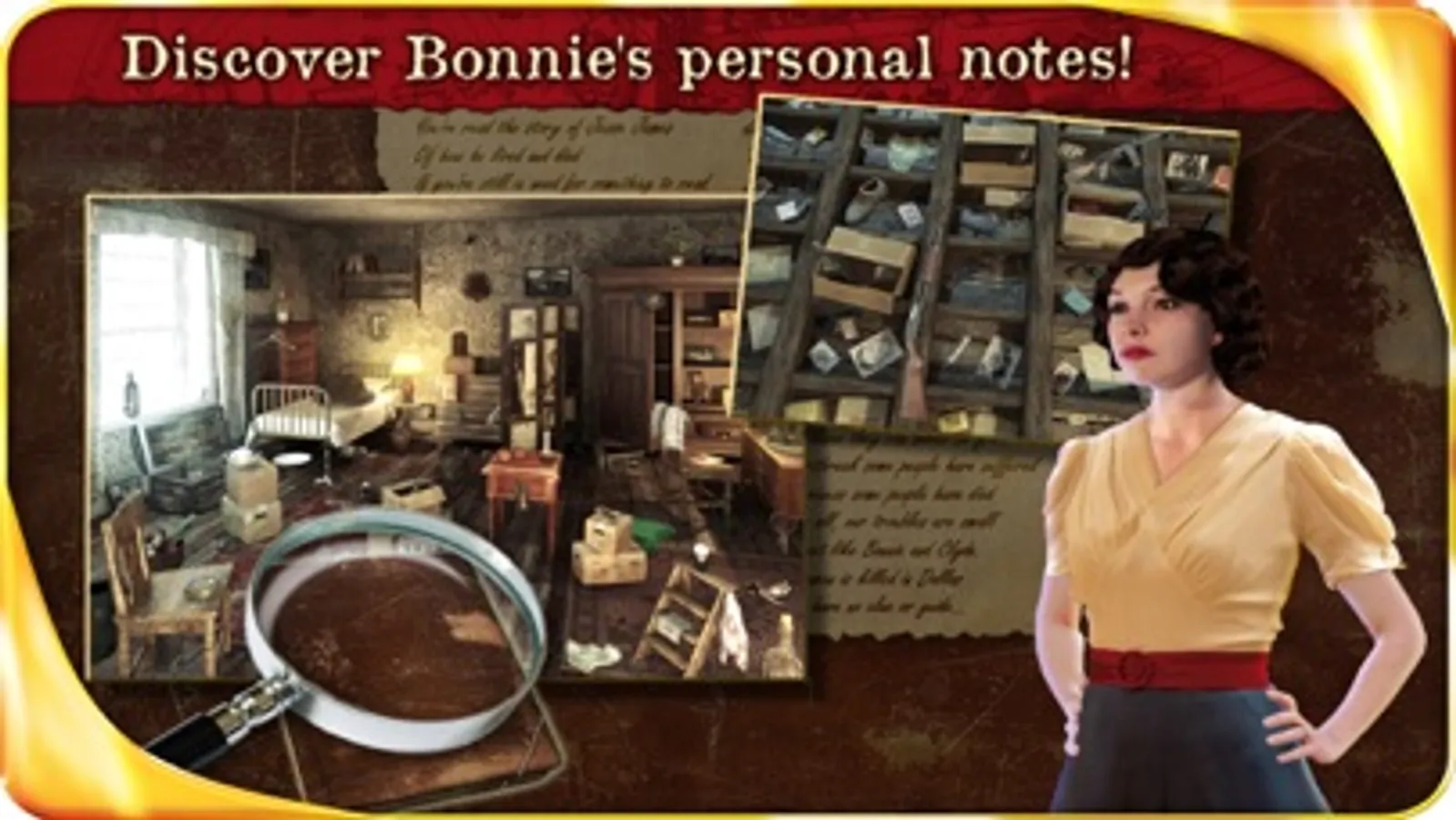 1933. Janette Jones Parker is a writer and has taken a room in the Red Crown Tavern in Platte City, Missouri, to write her next novel. She discovers it is where Bonnie & Clyde used to hide, and there she finds a notebook, which ends to be Bonnie’s log. Help Janette to decipher the strange message left by Bonnie along her journey!