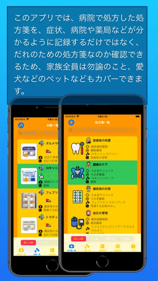 このアプリでは、病院で処方した処方箋を、症状、病院や薬局などが分かるように記録するだけではなく、だれのための処方箋なのか確認できるため、家族全員は勿論のこと、愛犬などのペットなどもカバーできます。
