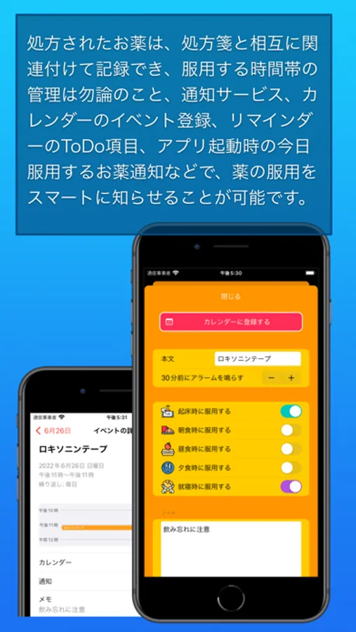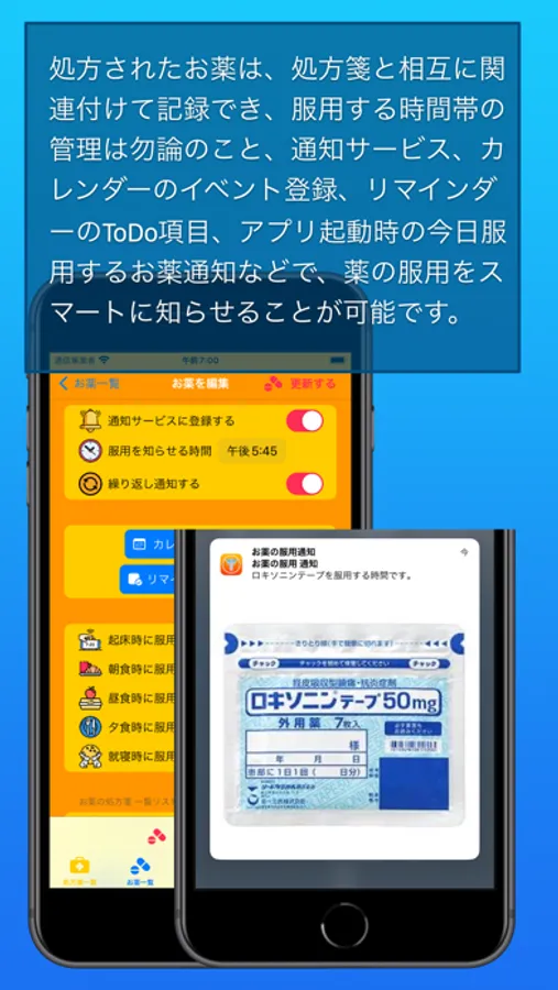 ・お薬を服用するタイミングを通知サービス、カレンダーのイベント、リマインダーのToDo項目などで知らせることが可能です。