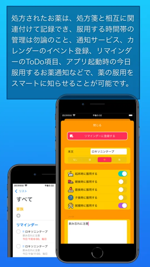 処方されたお薬は、処方箋と相互に関連付けて記録でき、服用する時間帯の管理は勿論のこと、通知サービス、カレンダーのイベント登録、リマインダーのToDo項目、アプリ起動時の今日服用するお薬通知などで、薬の服用をスマートに知らせることが可能です。