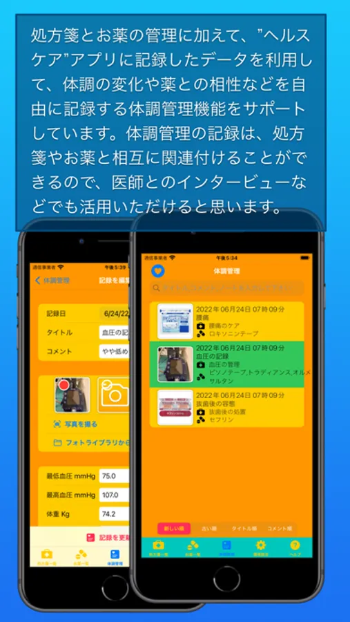 ・処方箋やお薬と相互に関連付けが可能な体調管理の記録機能をサポートしています。