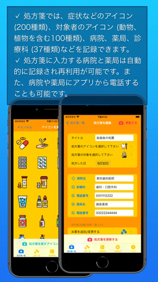 ・処方箋では、症状などのアイコン (200種類)、対象者のアイコン (動物、植物を含む100種類)、病院、薬局、診療科 (37種類)などを記録できます。
