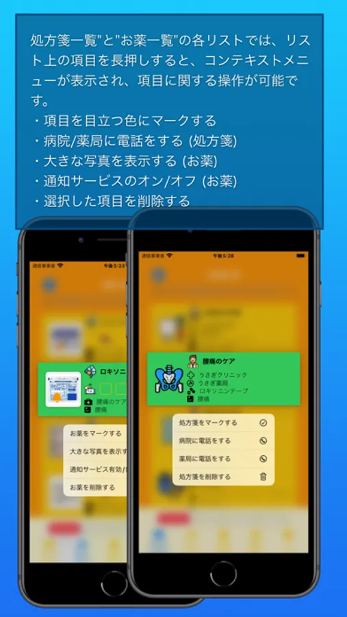 ・処方箋に入力する病院と薬局は自動的に記録され再利用が可能です。また、病院や薬局にアプリから電話することも可能です。