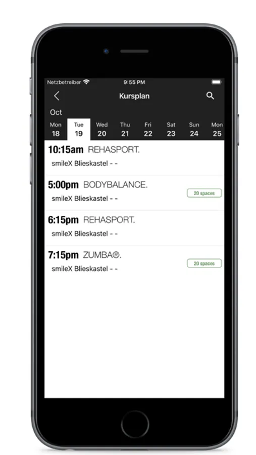 Direkter und aktueller Zugriff auf den Kursplan Deines smile X Fitness Clubs von überall: Für jeden Kurs kannst Du Details wie Zeit, Kursbeschreibung, Raum und Merkmale wie z.B. den Schwierigkeitsgrad einsehen.