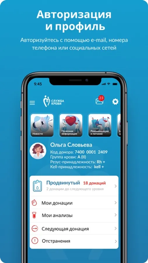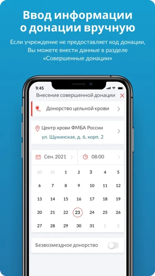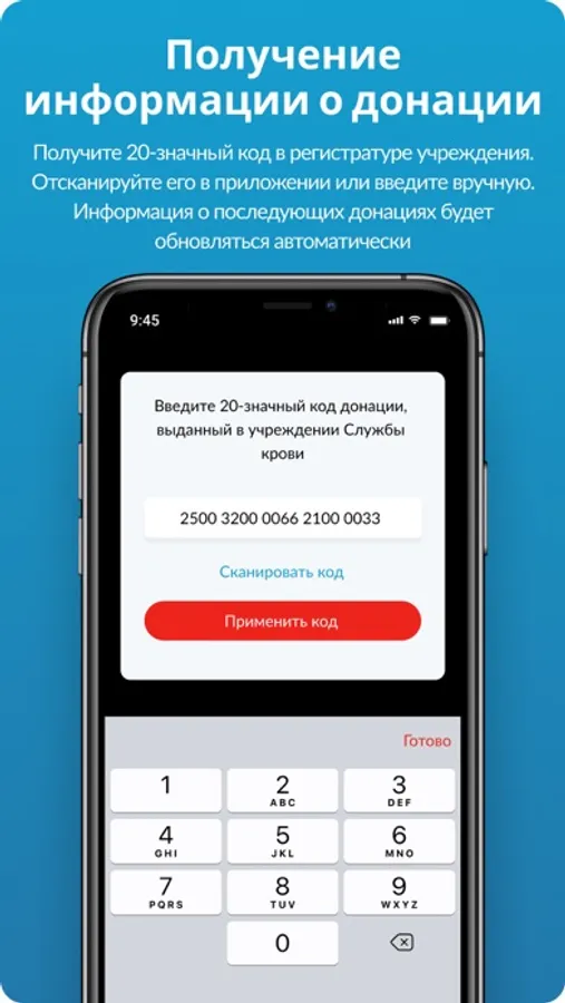 Для доступа к полному функционалу приложения необходимо получение 20-значного кода донации в регистратуре учреждения службы крови, где была выполнена последняя процедура.