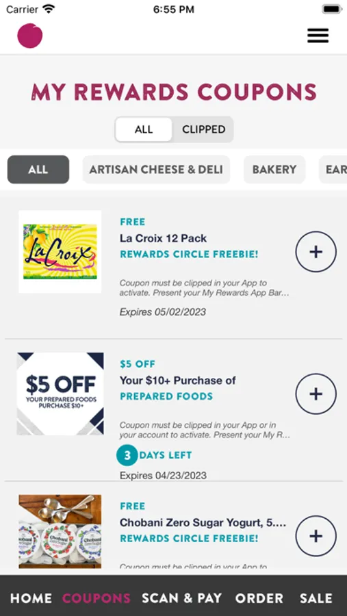 Redeem Clipped Coupons, Rewards Cash, and Freebies at checkout when you scan the barcode in your app.