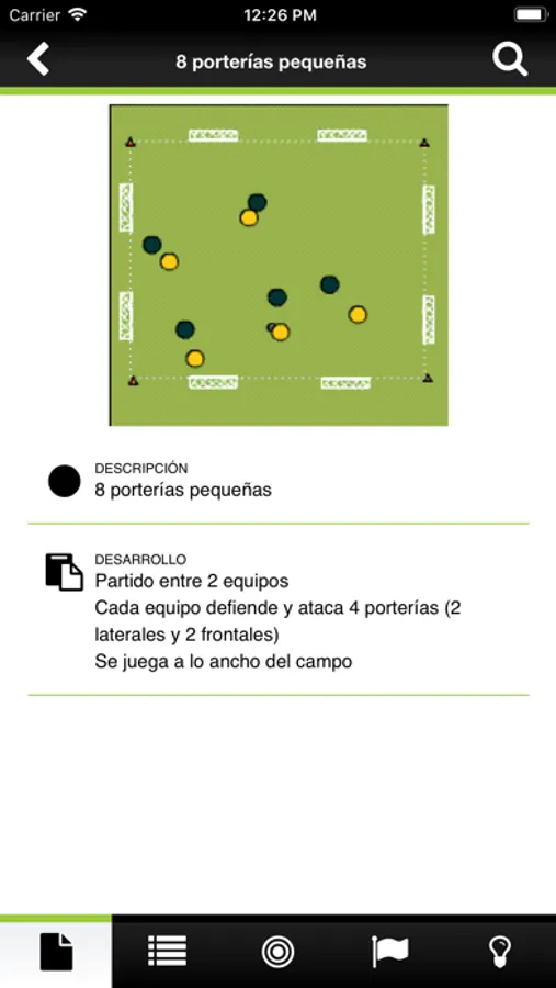 Cada ficha contiene un gráfico en movimiento que facilita la comprensión del mismo. A su vez incluye diferente información complementaria como: Descripción/desarrollo, tiempos y repeticiones, dificultad, dimensiones del terreno necesario, consejos, elementos físicos necesarios, etc...