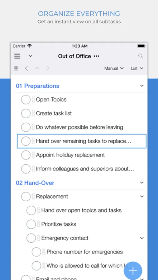 Organize:Me helps you to cut complex situations down to what matters. With the built-in sync feature you can access your tasks with Organize:Me, Organize:Pro and Taskfabric for all major mobile and desktop platforms.