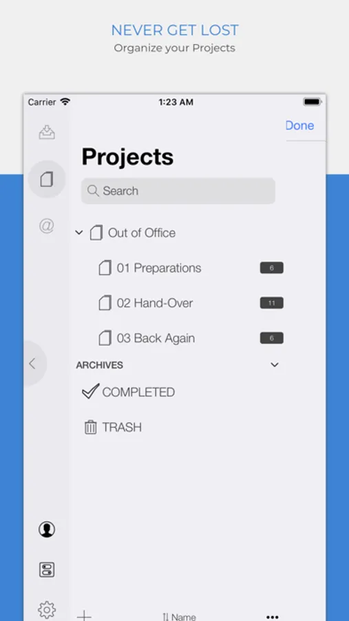 • Multiple sorting options for projects, contexts and task lists