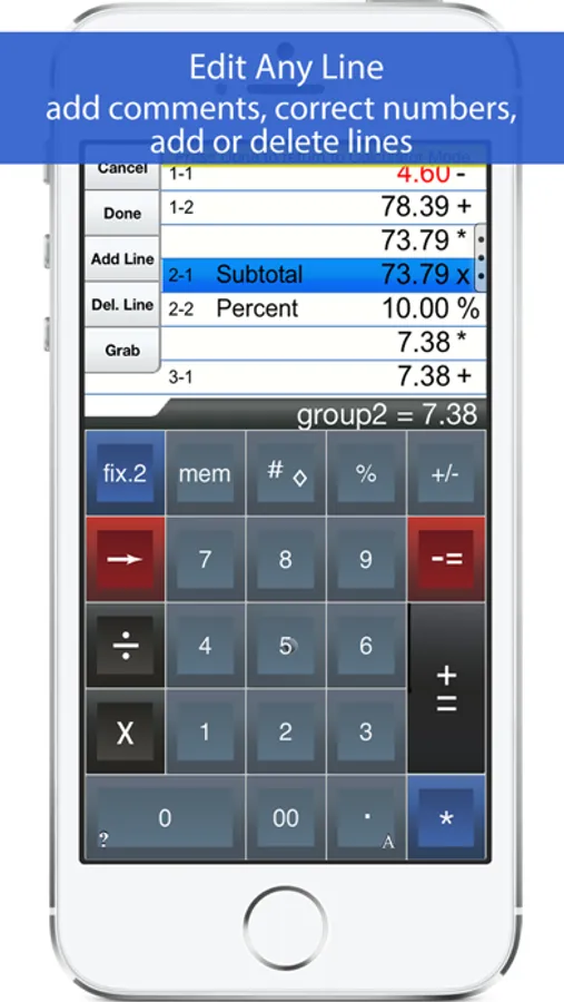 A3. Touch any line of the paper tape to go into edit mode. Touch the side controls: Add Line, Delete Line. You can also edit numbers, split Add/Sub or Mul/Div groups. Press Done to return to Calculator mode.