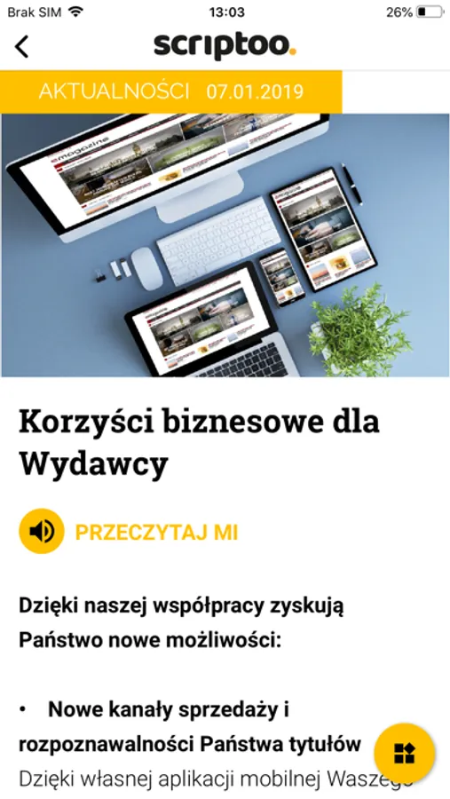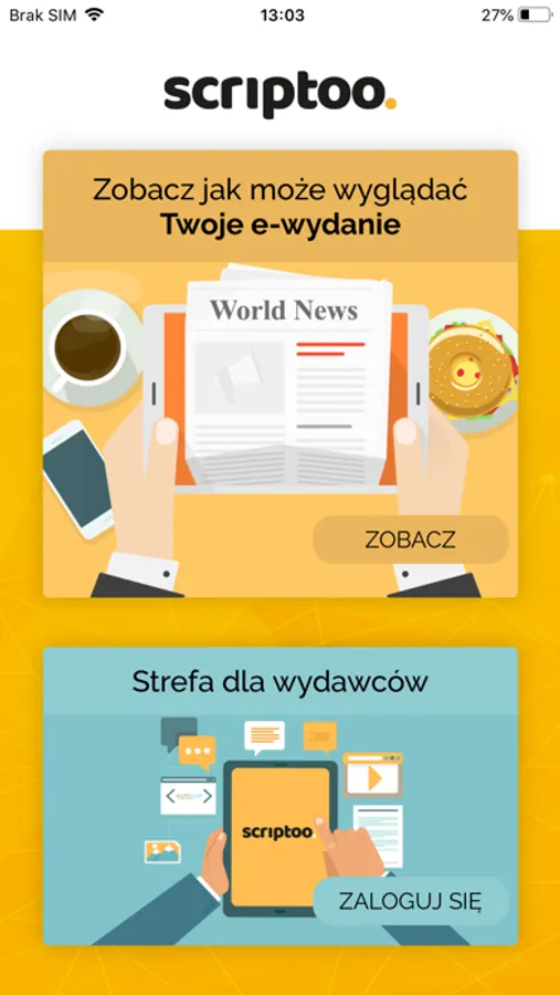 Aplikacja Scriptoo pozwala zapoznać się z możliwościami, jakie można zaoferować czytelnikom odbierającym Państwa treści przez dedykowaną aplikację mobilną. Aplikacja zapewni dostęp do e-wydań w nowoczesnym i przyjaznym środowisku. Pozwoli także na udostępnianie dodatkowych treści, w postaci strumienia aktualności, które można wykorzystać na potrzeby redakcyjne, marketingowe i reklamowe lub w innych celach. Dzięki tej funkcjonalności oraz systemowi alertów Push, wydawcy podnoszą zaangażowanie czytelników, oferując ciekawe treści w dowolnym czasu i miejscu, a nie tylko w ramach tradycyjnych wydań.