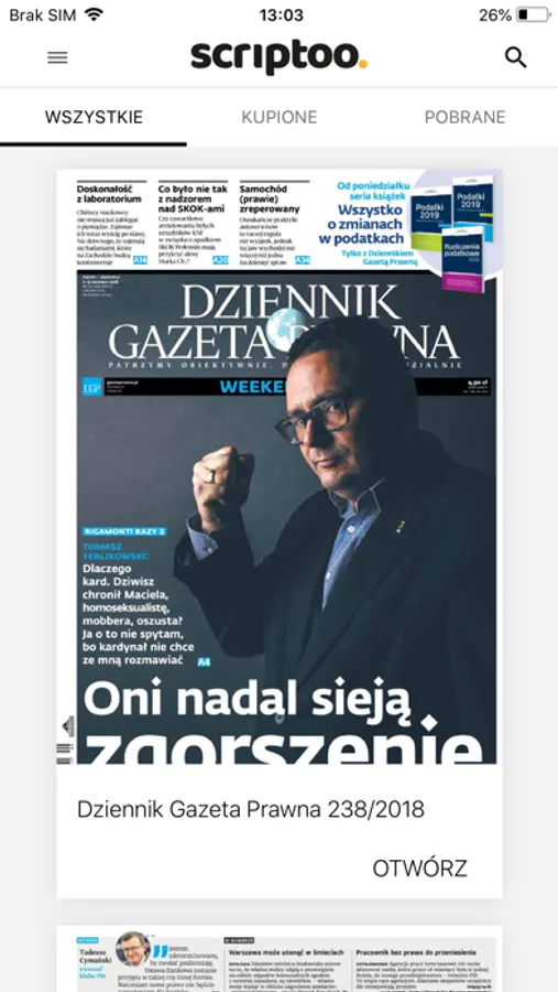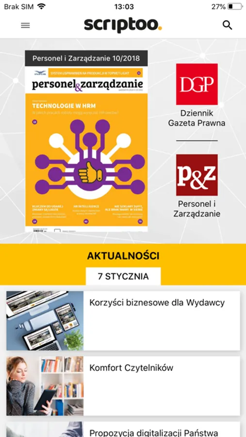 Aplikacja mobilna Scriptoo udostępnia przykładowe numery czasopism wiodącego na polskim rynku wydawnictwa Infor PL, będącego liderem dystrybucji wydań elektronicznych. Oferujemy Państwu dostęp do dwóch wydań Dziennika Gazety Prawnej oraz wydania miesięcznika Personel i Zarządzanie.