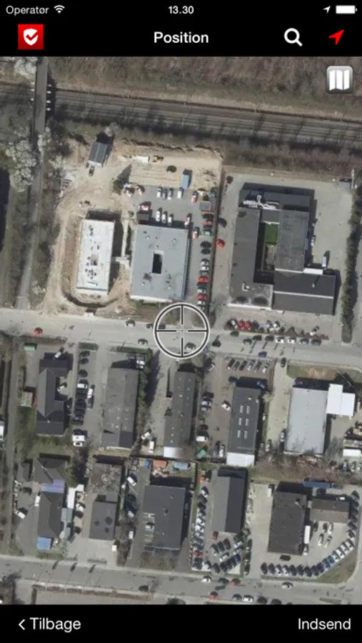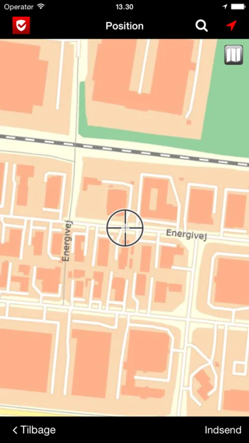 Nu vises din position på et kort og du har mulighed for at flytte et sigtekorn til præcis det sted hvor du har observeret skaden. Derefter sendes hele din indberetning til kommunen som herefter vil se på skaden.