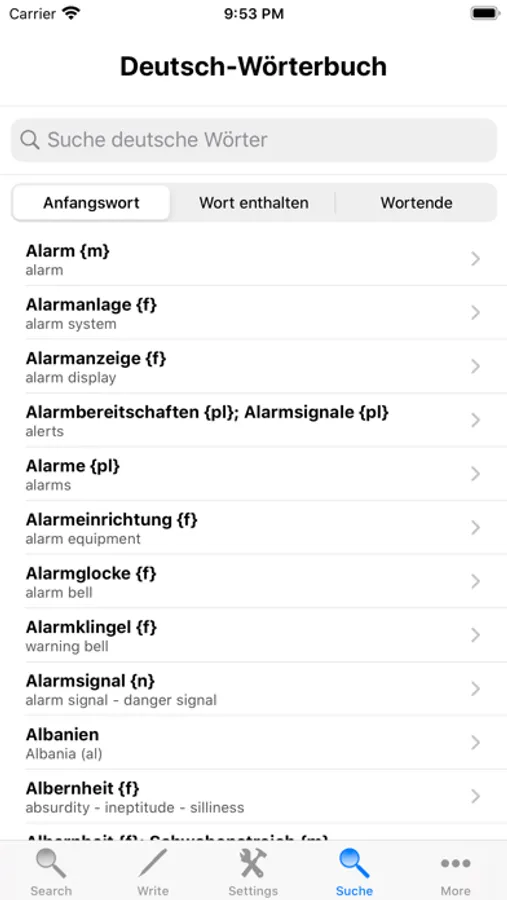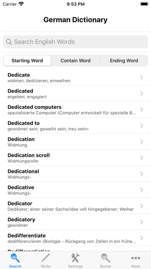 - Search the English word and it will display its German translation.