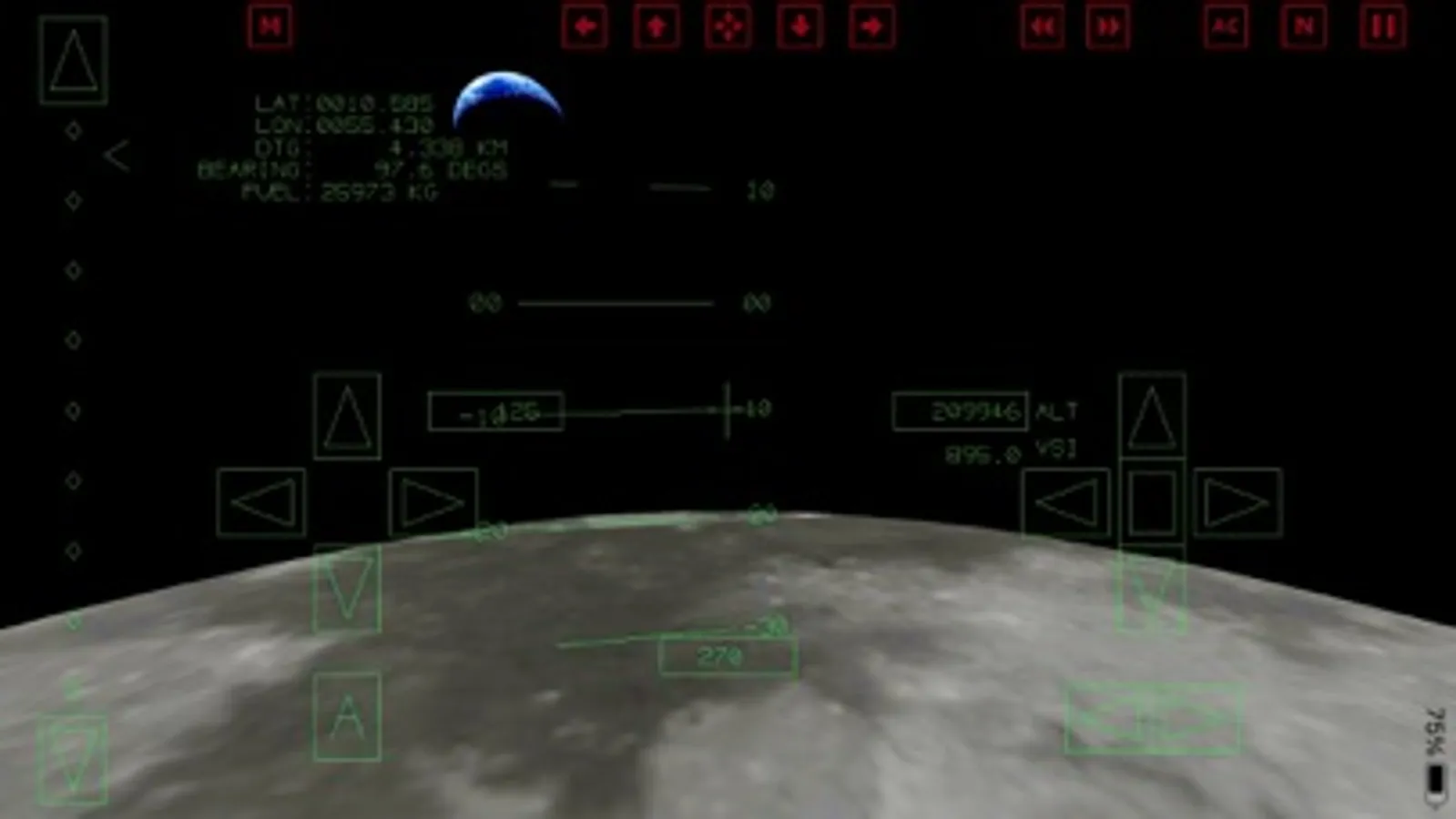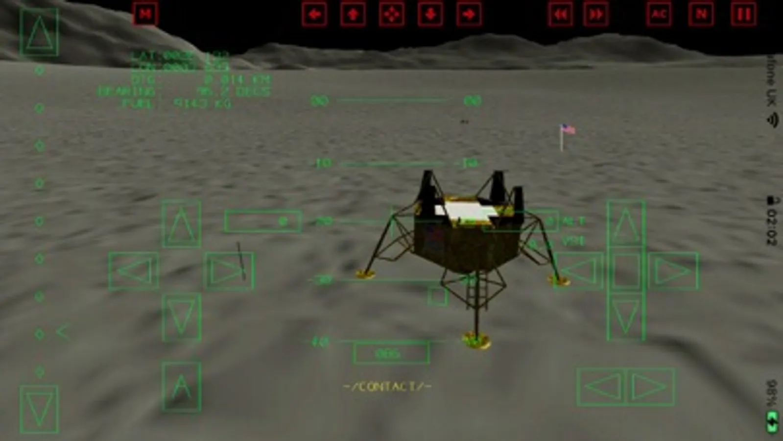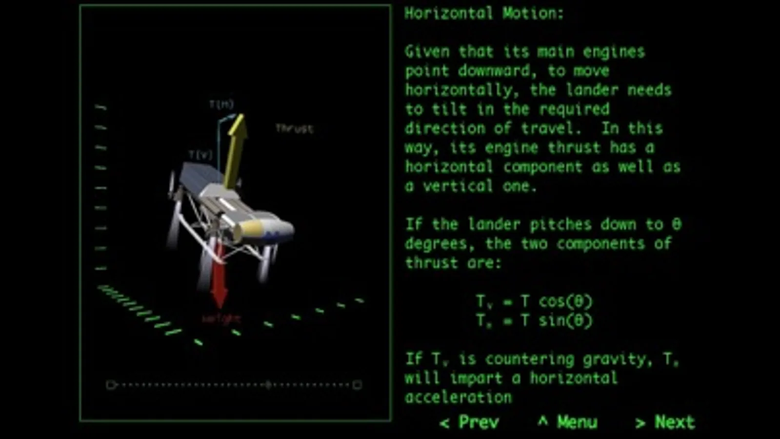 - The real physics of the lander's movement and dynamics are represented, using the same high fidelity techniques used in real aerospace flight simulators. This includes: varying mass and rotational inertia as fuel is used up, the thrust of the main engines and reaction control rockets, plus all velocities, forces and accelerations acting on the vehicle, just as they would in an airless lunar gravity environment.