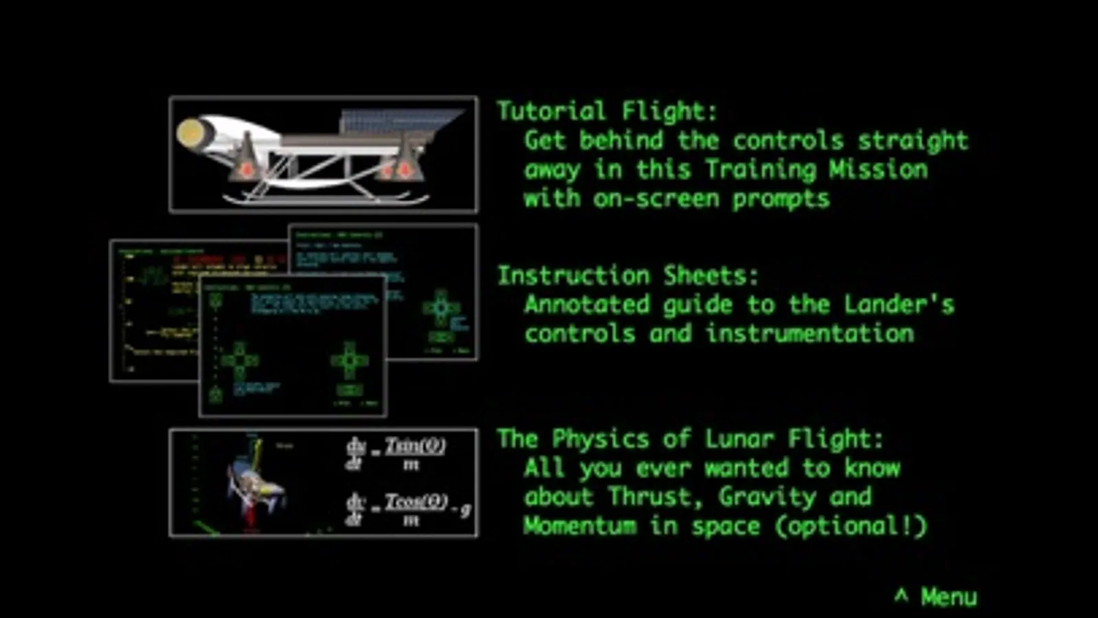 - Comprehensive help screens show all controls and instrumentation within the HUD (Head-Up-Display), including a training flight with on-screen prompts to help you fly the lander. The first mission even begins with the lander in flight, allowing you to get the feel of the craft right from the start.